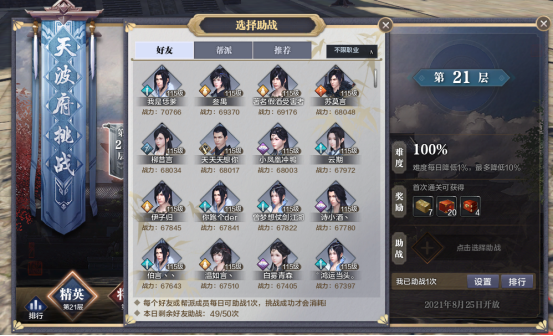 少侠可以在助战位置选择一名同帮派成员或者好友进行助战,被选择为助战的少侠为AI控制,不受本身角色属性影响,均为固定值,血量12.5万。