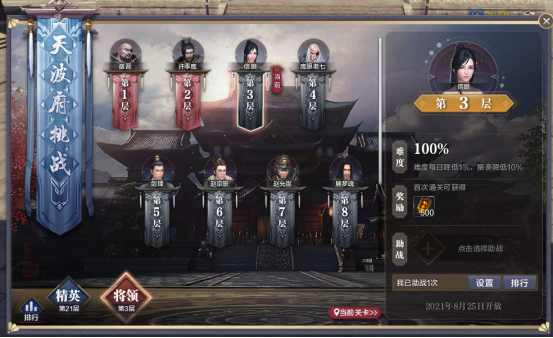 将领试炼的对象均为BOSS,通关限时3分钟,第一批将领试炼开放1~2层