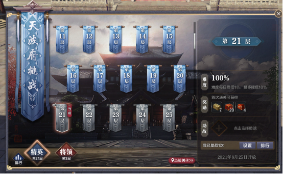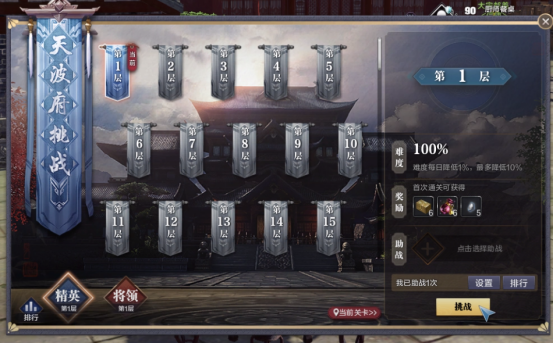 在天波府试炼界面中,可以查看已通关的试炼层数、当前层数难度以及奖励